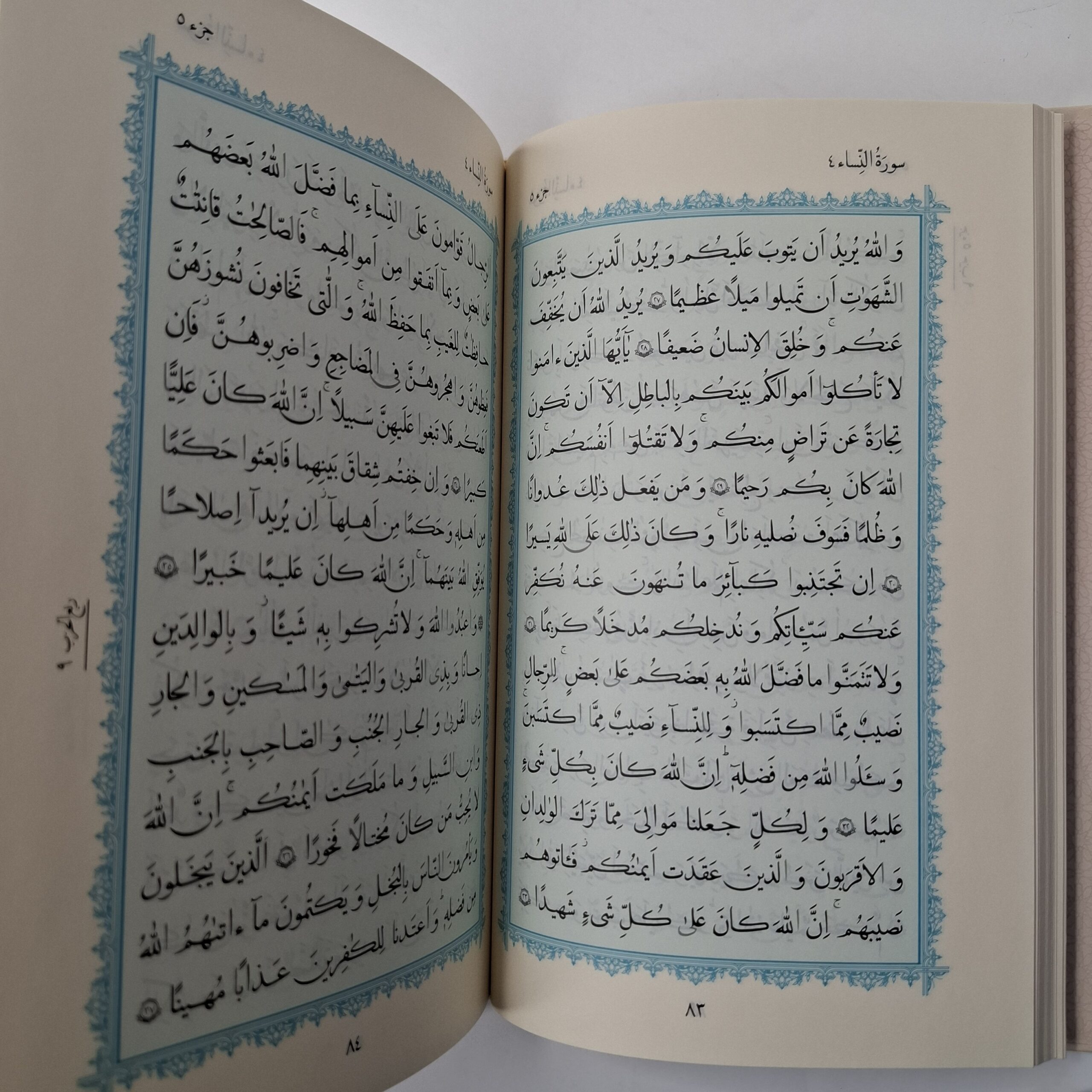 صفحات این قرآن با کاغذ تحریر باکیفیت چاپ شدهاند؛ کاغذی سبک، مقاوم و مناسب برای استفاده طولانیمدت. رنگ زمینهی آبی ملایم صفحات، جلوهای آرامشبخش ایجاد کرده و فضای معنوی تلاوت را دوچندان میکند. این رنگبندی خاص، علاوه بر زیبایی بصری، به تمرکز بیشتر خواننده کمک کرده و تجربهای روحانی و متفاوت از مطالعه قرآن کریم را به همراه دارد.